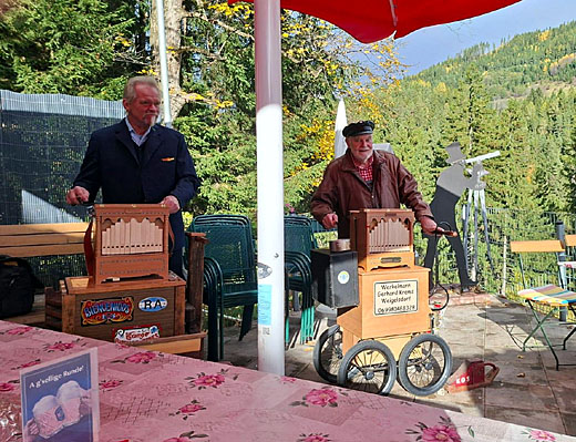 | Am Samstag, den 25. Oktober spielten Gerhard Krems & Thomas Blaschke mit ihren Drehorgeln zum Saisonende zur Freude unserer Besucher auf. Wie immer ist bei den beiden Künstlern die Stimmung ausgezeichnet. | ||||||||||||
